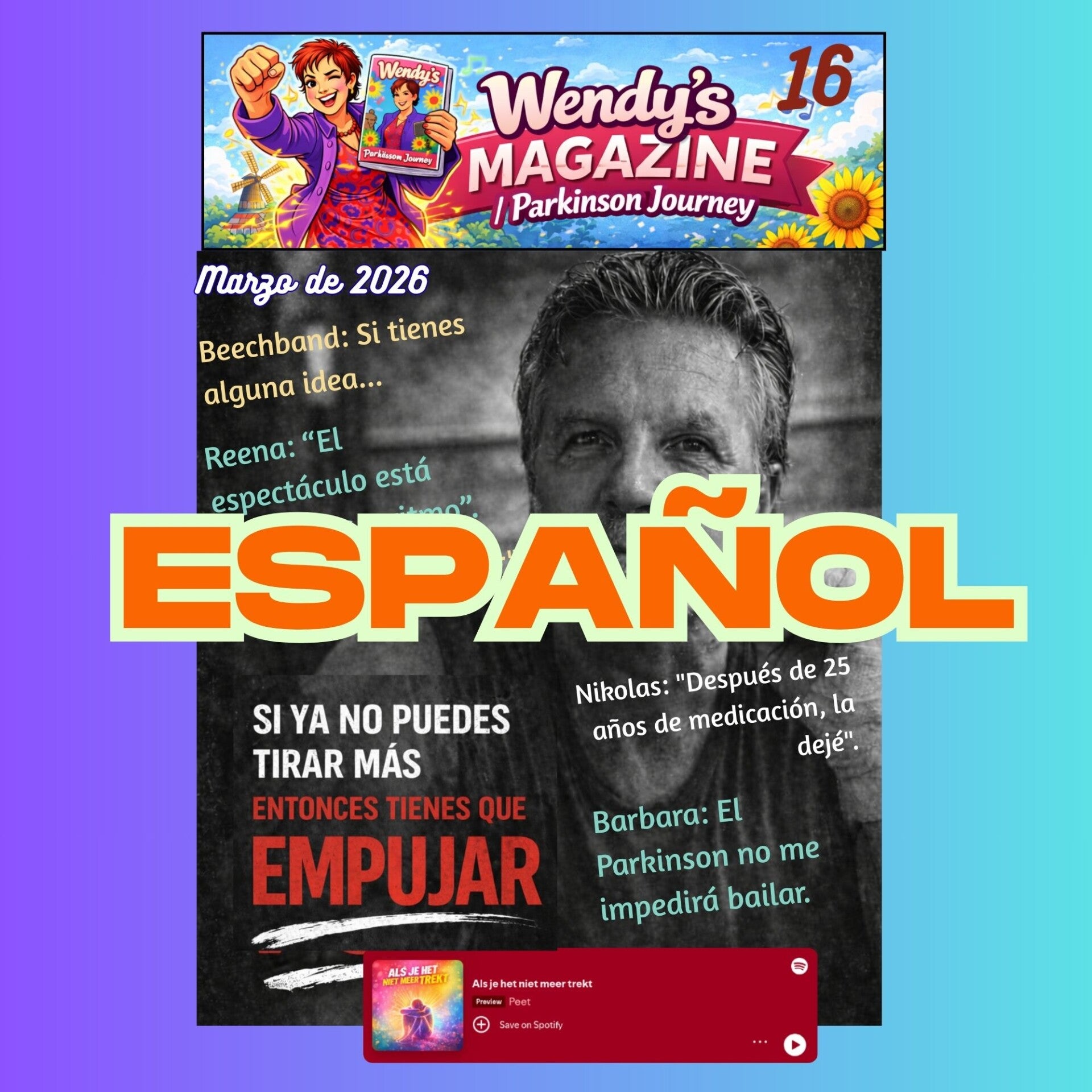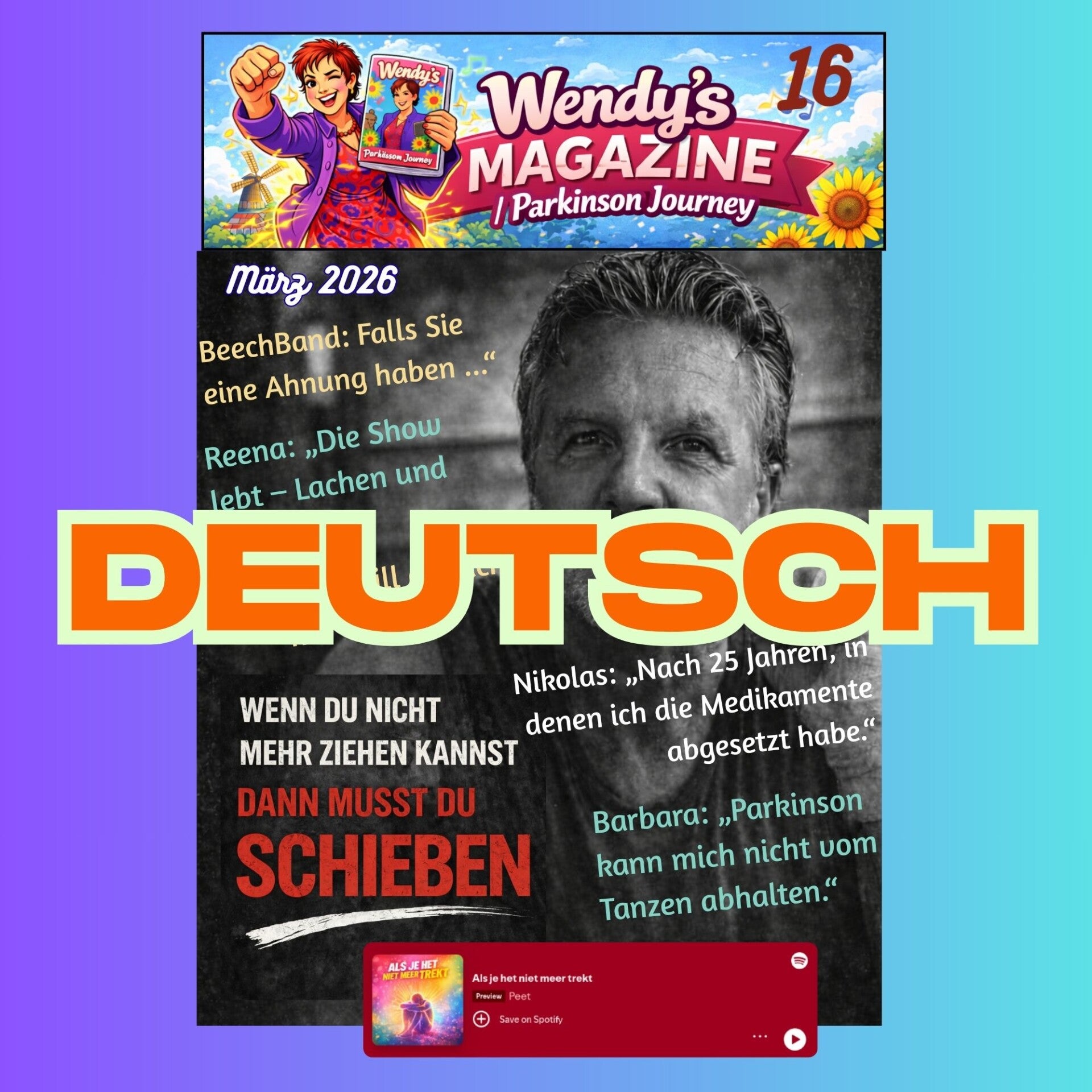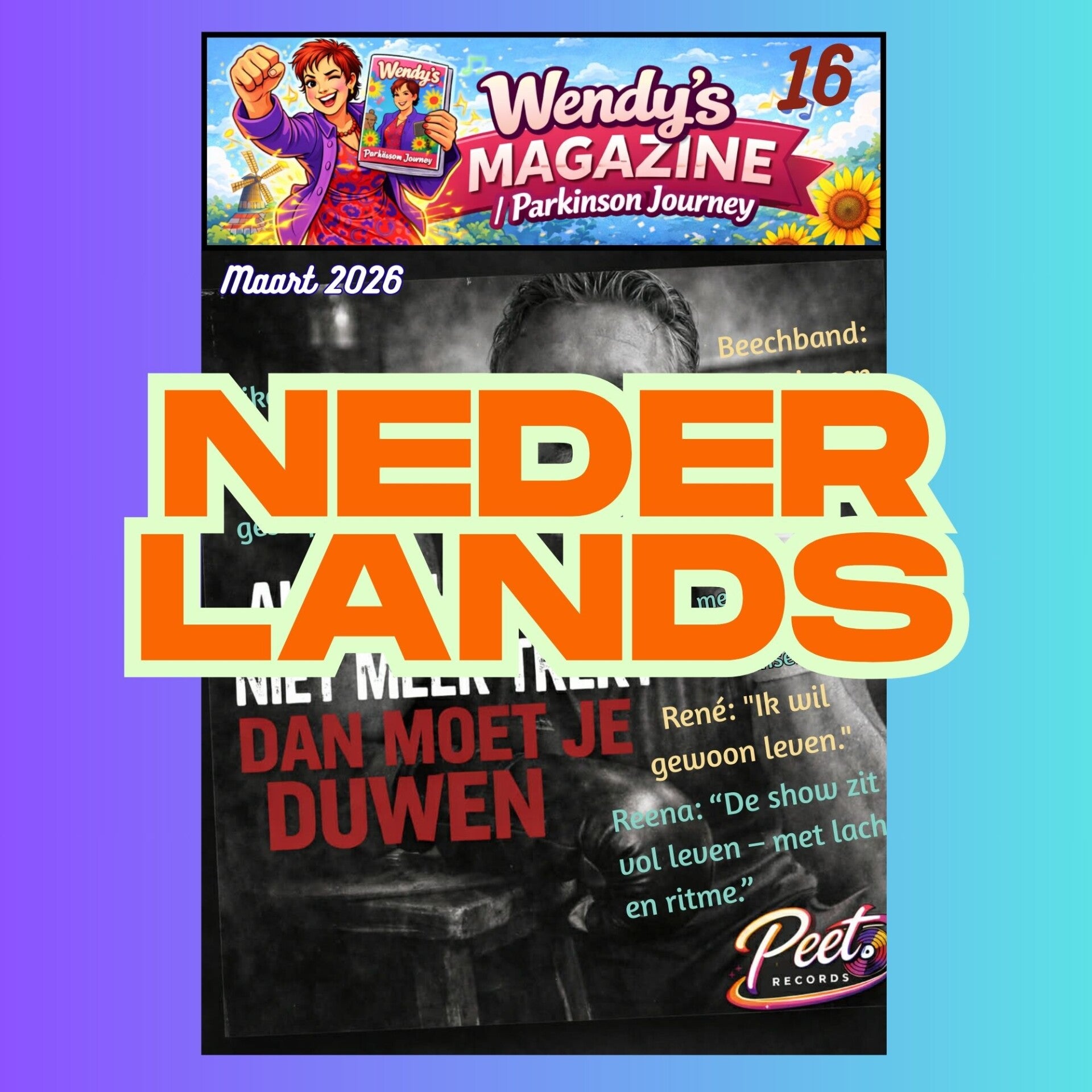 The new Wendy's Magazine Parkinson Journey is online. Scroll below to go to the language you want. Click on the language name and you will find the amazing magazine with inspiring interviews with people with parkinson's telling their story, their experiences, but also information about the BeechBand. Do you know BeechBand already? Well take a look yourself for this amazing book. And do not forget to listen to the song of Peet via spotify. All those amazing people and you can read their stories for FREE on this website. Enjoy it.