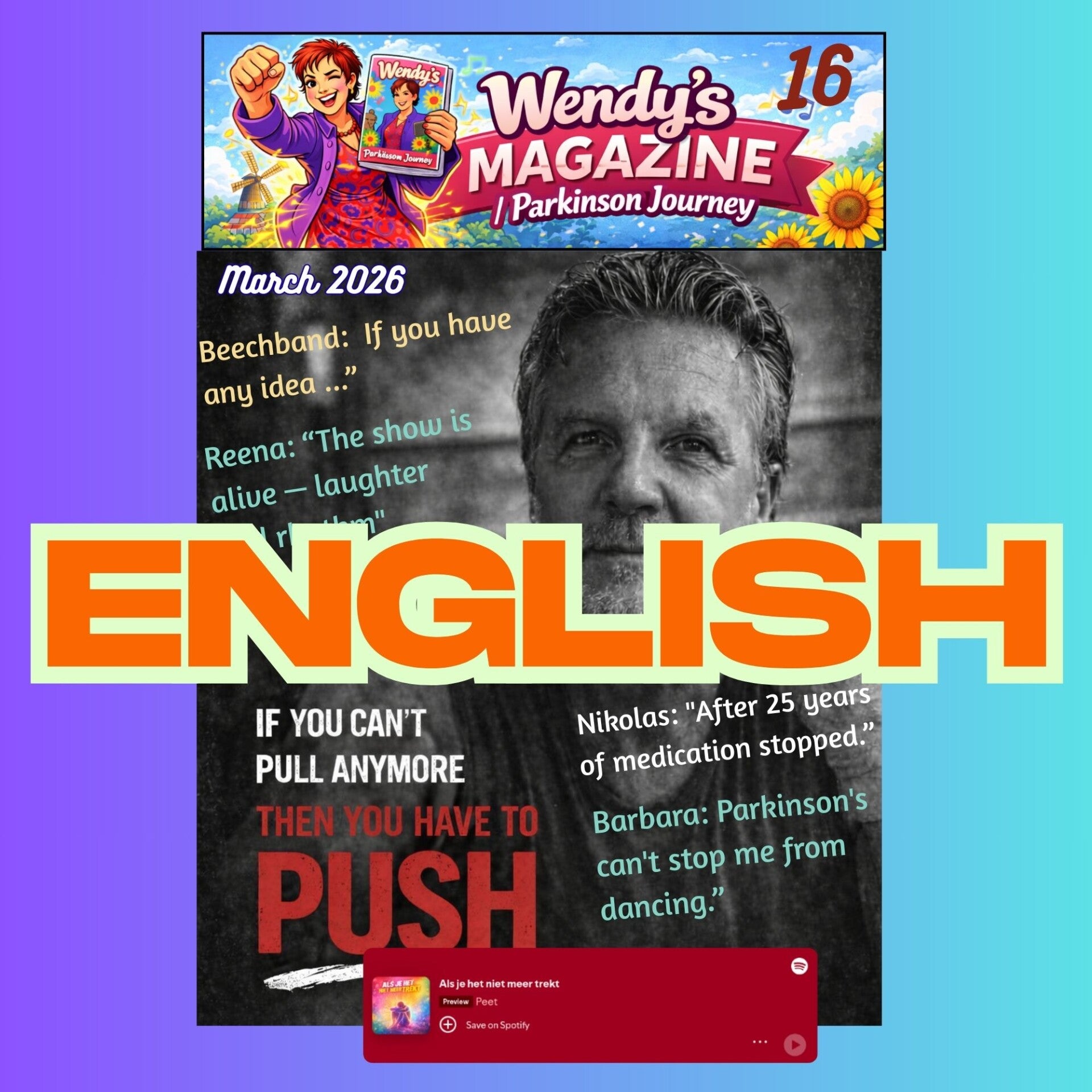 Wendy kreeg de diagnose parkinson op 47 jarige leeftijd. Zes jaar na haar diagnose richtte zij dit magazine op. In het magazine deelt ze ervaringsverhalen en tips met als doel verbinding te creëren en haar positieve kijk op het leven te delen. Het magazine is niet voor niets genaamd ‘Geniet van het leven’.